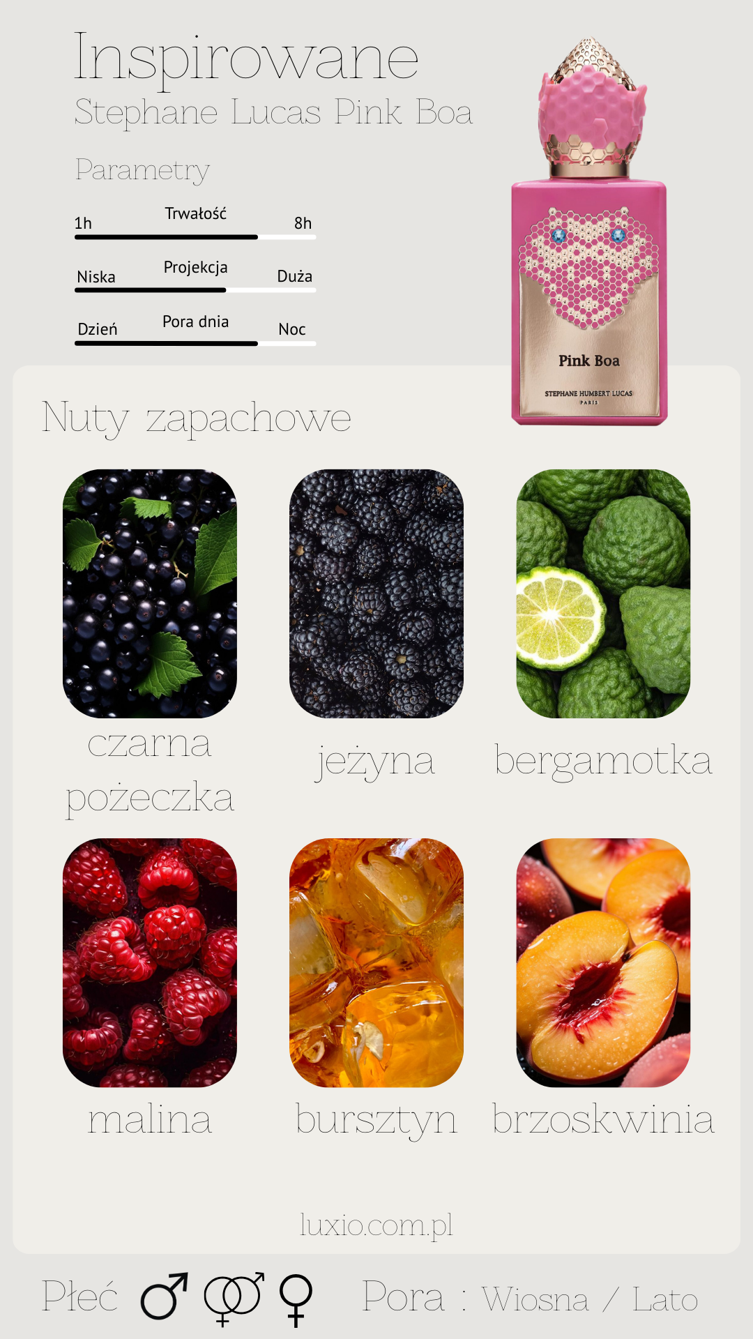 Owocowa lemoniada zamknięta w butelce, idealna na upalne, letnie dni. Lekki, energetyzujący i radosny, sprawdzi się zarówno dla kobiet, jak i mężczyzn, podkreślając beztroski charakter lata. To unisexowy klon kultowego Pink Boa, który wnosi do codzienności nutę orzeźwienia i swobody.