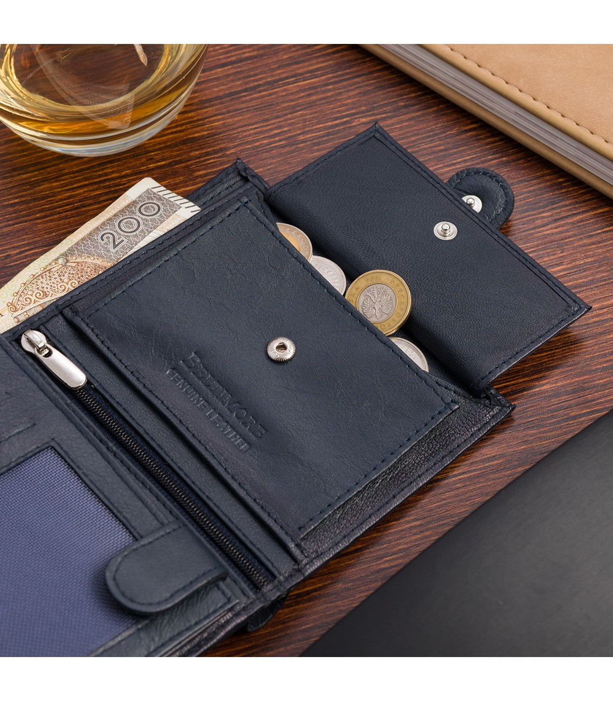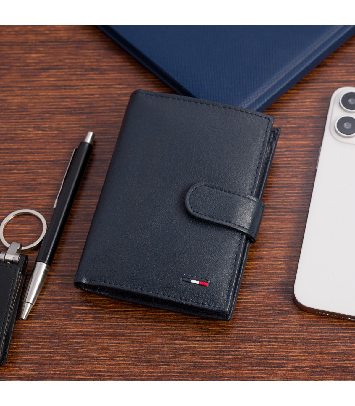 ✔ Model D45 w granatowym kolorze – pionowa orientacja, z zewnętrzną zapinką, a jego wnętrze z łatwością mieści dowód rejestracyjny pojazdu.